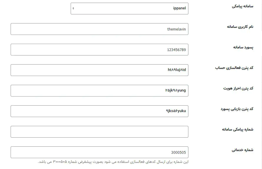 این شماره تنها برای ارسال کدهای تایید می باشد حتما باید یک شماره خدماتی ثبت شود بصورت پیشفرض شماره 3000505 ثبت می شود.