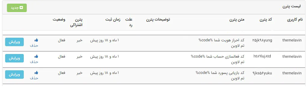 بعد از ثبت متن ها و تایید آن توسط سامانه پیامک کد پترن که در ستون دوم ایجاد شده است را باید داخل کادرهای کد پترن تنظیمات افزونه ثبت نمایید.
