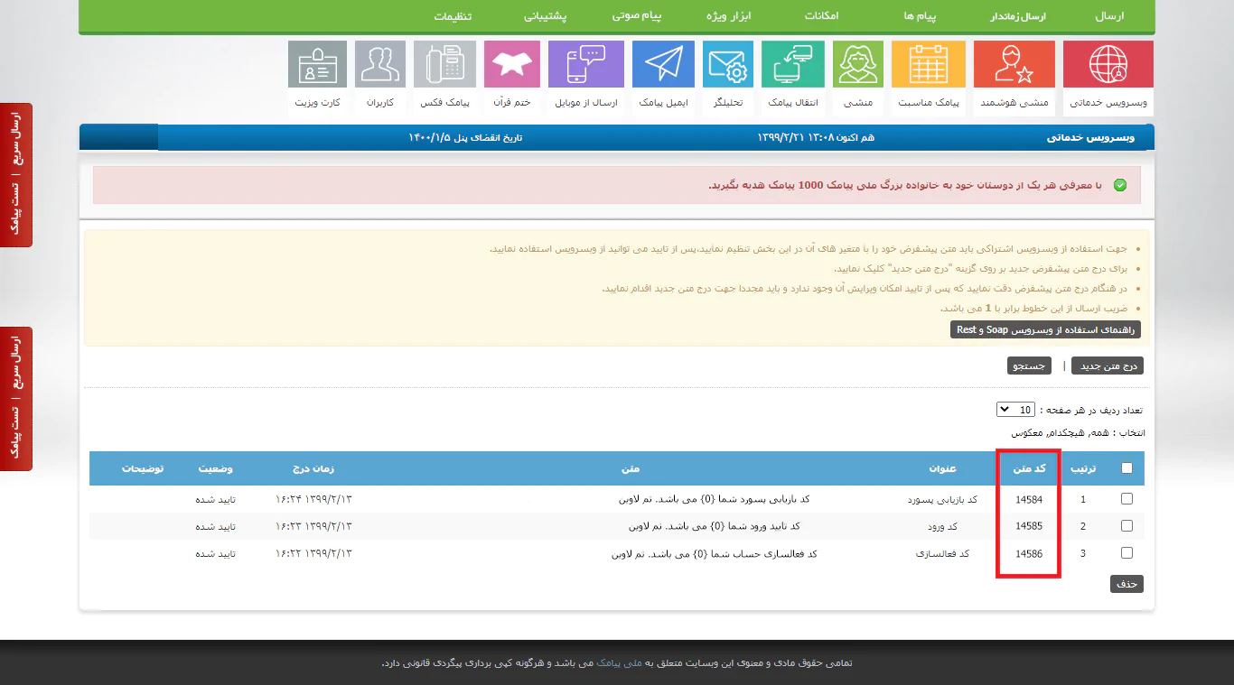 برای دریافت کد متن به سامانه پیامکی خود مراجعه میکنید منوی ابزار ویژه > وب سرویس خدماتی را انتخاب میکنید در این بخش میتوانید متن های کد تایید خود را ایجاد کنید برای ایجاد متن ها می توانید نمونه هایی مانند متن های زیر را ایجاد نمایید: