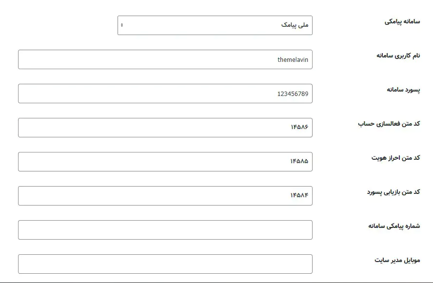بعد از ثبت متن ها و تایید آن توسط سامانه پیامک کد متن که در ستون دوم ثبت شده است را باید داخل کادرهای کد متن تنظیمات افزونه ثبت نمایید.