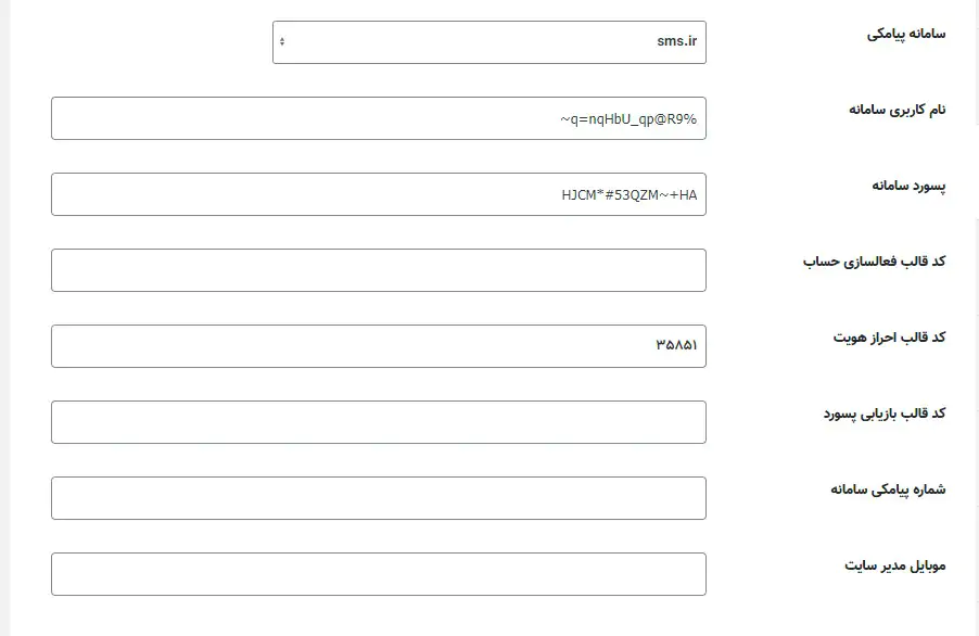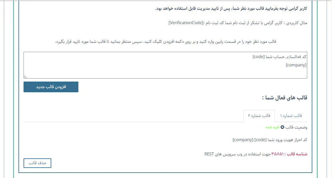 بعد از ثبت قالب و تایید آن توسط سامانه پیامک شناسه قالب که در پایین متن های ثبت شده قرار دارد را باید داخل تنظیمات پیامک افزونه ثبت نمایید