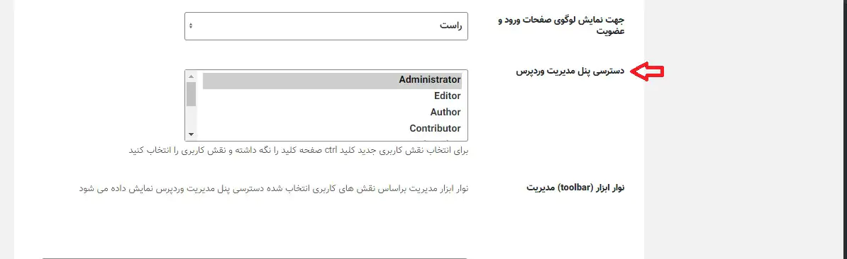 برای اضافه کردن دسترسی نقش های کاربری دیگر وارد منوی مدیریت کاربران > تنظیمات > تنظیمات عمومی شوید از گزینه دسترسی پنل مدیریت وردپرس میتوانید نقش کاربری خود را اضافه کنید.